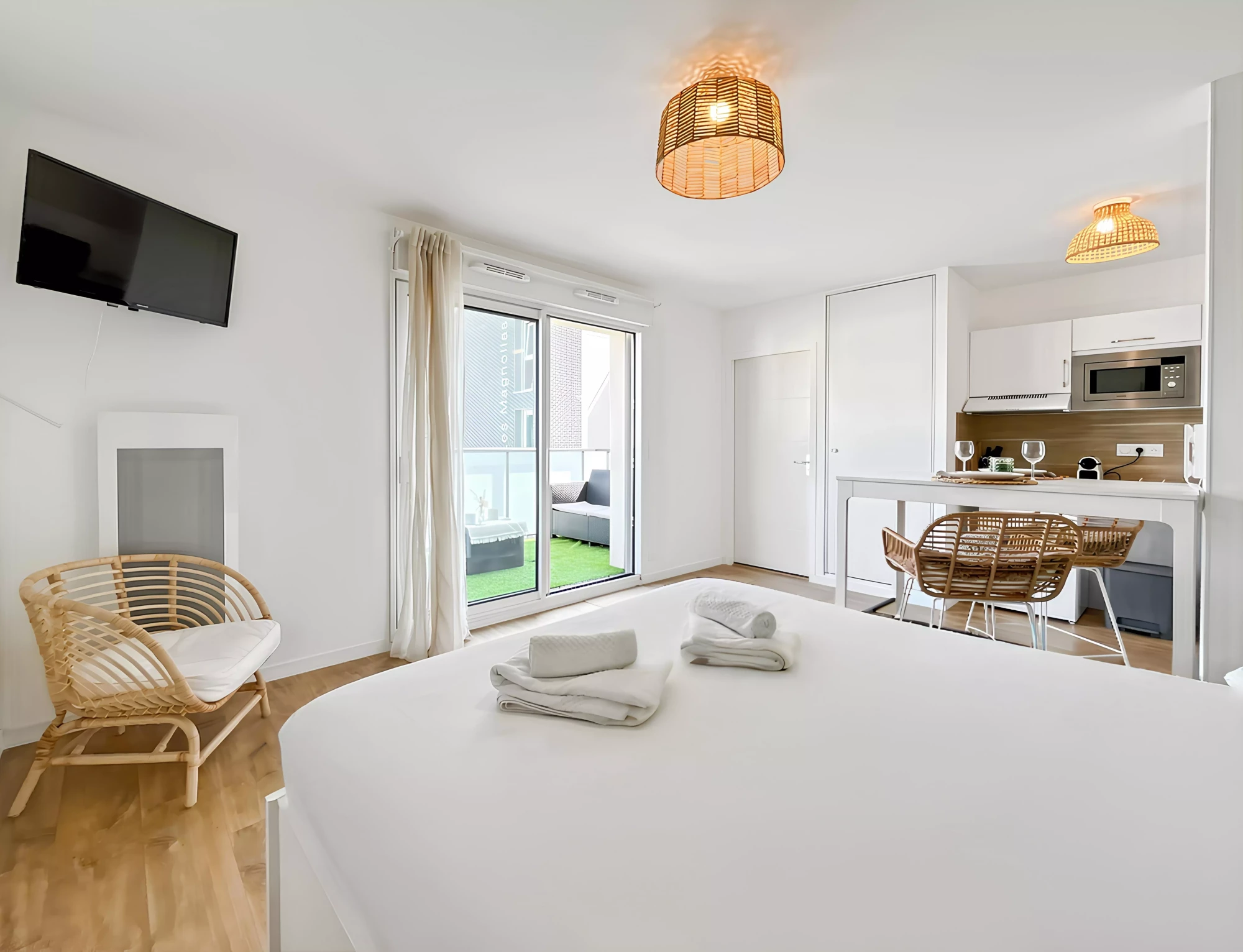 À l’extérieur, une grande terrasse privée vous invite à savourer un petit-déjeuner ensoleillé ou à vous détendre en soirée.