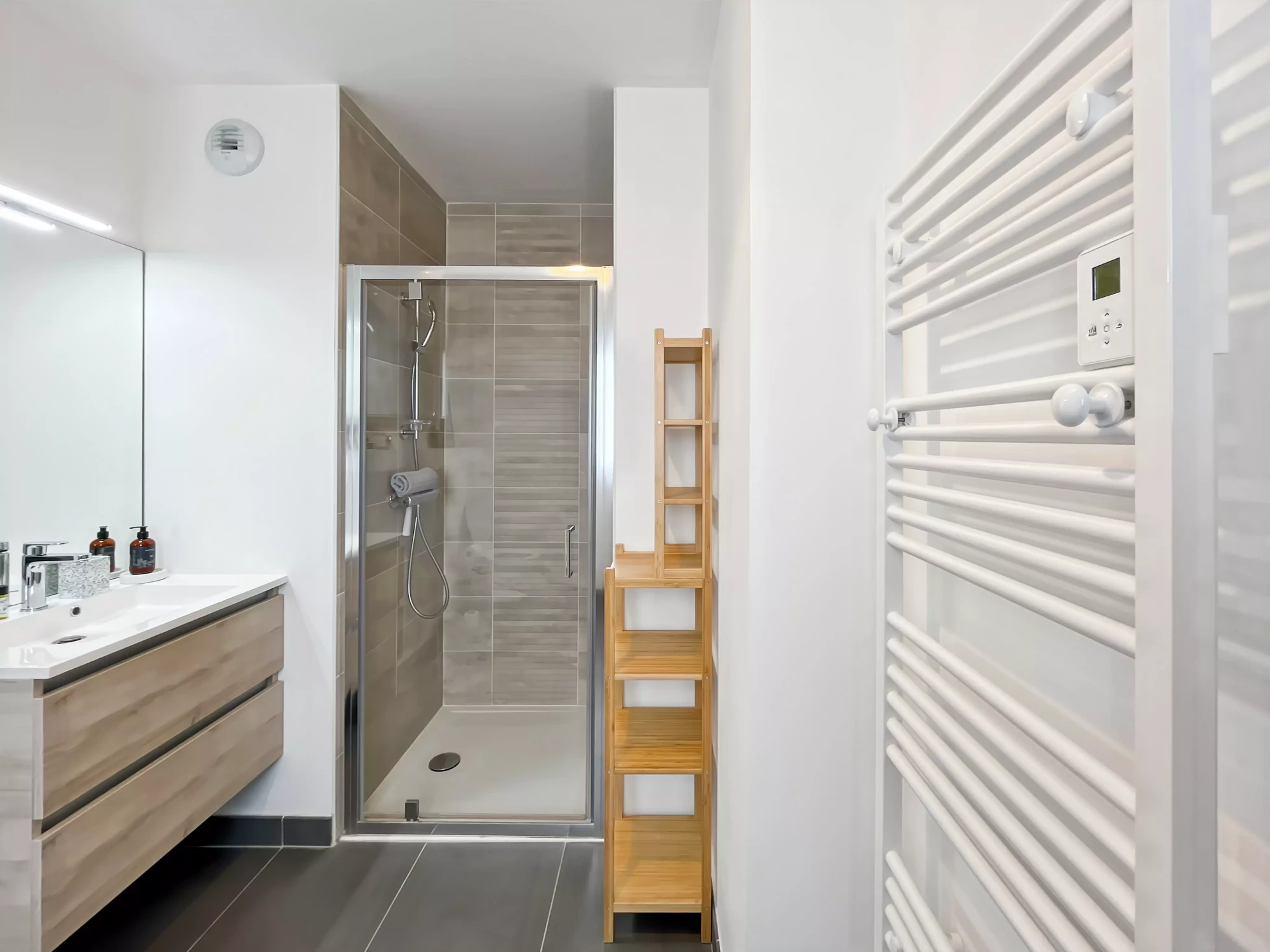 La salle d’eau moderne et élégante dispose d’une douche à l’italienne.