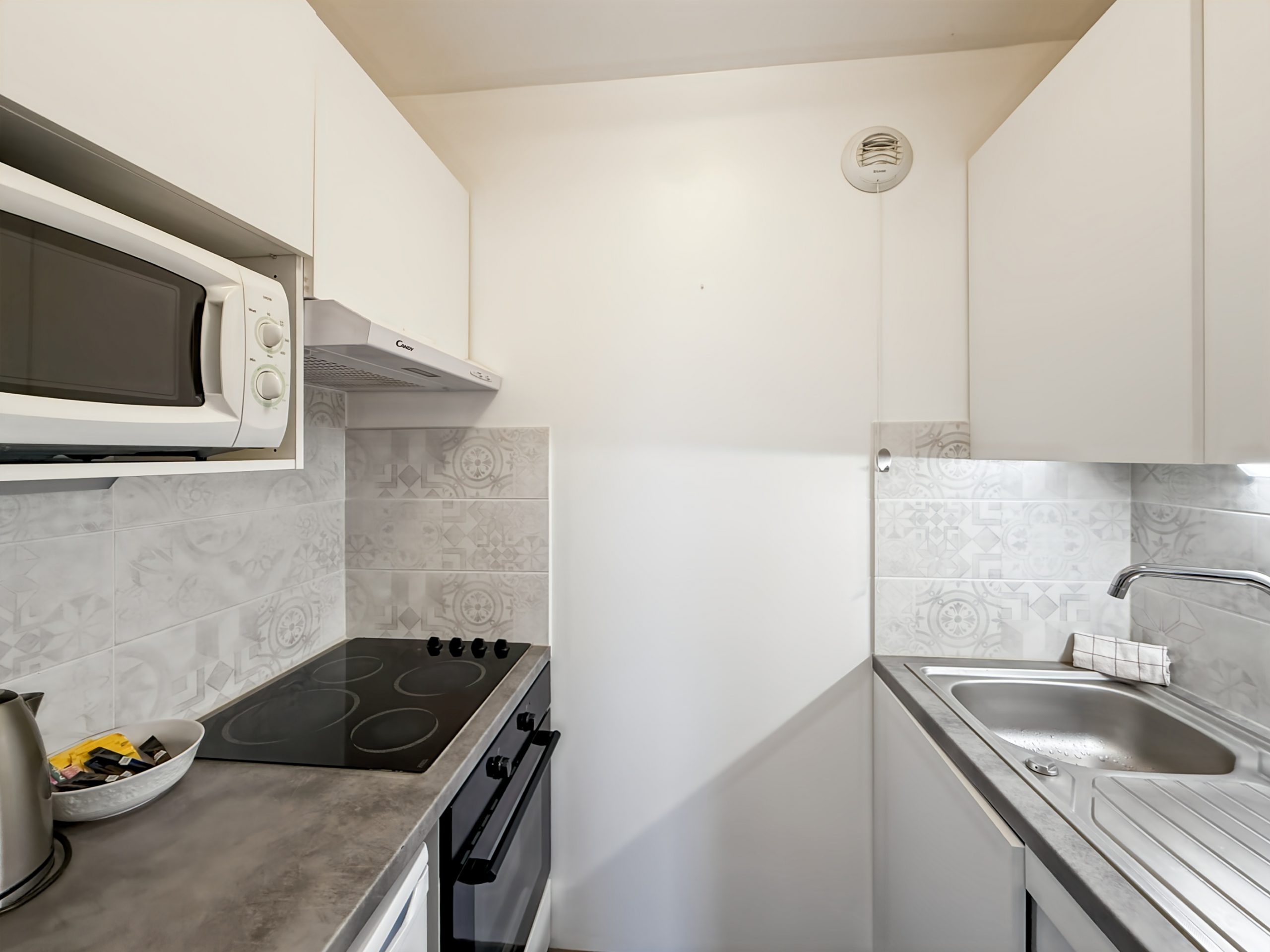 La cuisine, entièrement équipée (plaques, réfrigérateur, micro-ondes, cafetière et tous les ustensiles nécessaires), vous permettra de savourer vos repas face à l’océan.