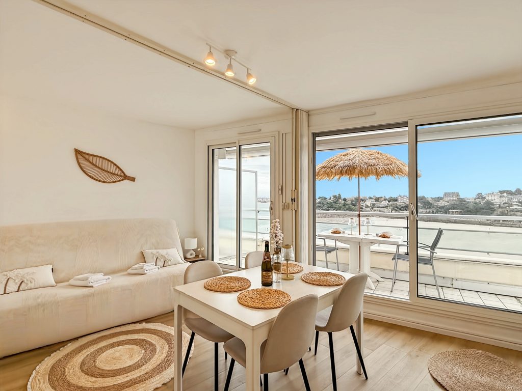 Le Crystal est un appartement d’exception niché au 10ᵉ et dernier étage, au cœur de la mythique plage de l’Écluse à Dinard, offrant une vue imprenable sur la mer.