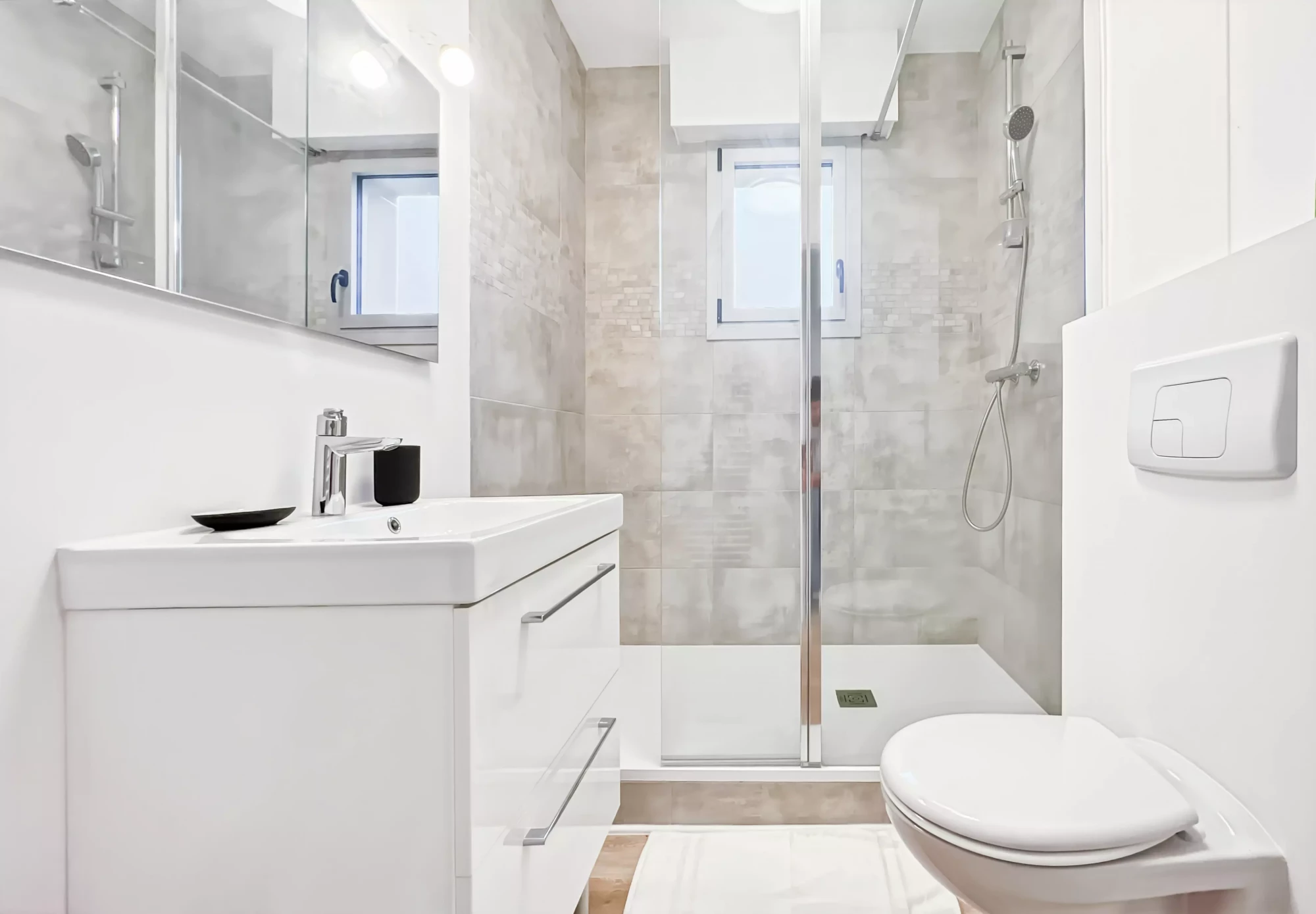 La salle d’eau moderne et raffinée offre une belle douche à l’italienne.