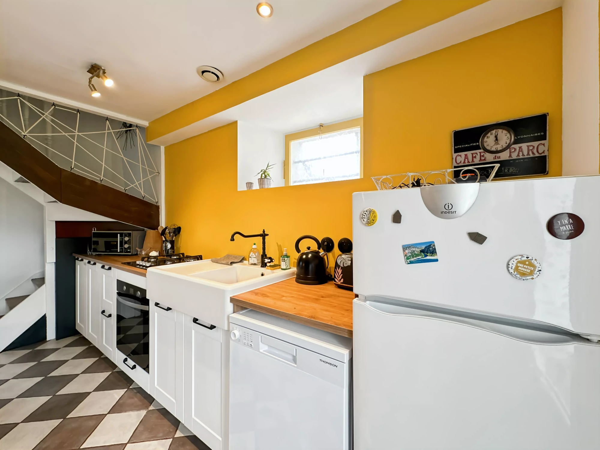 La cuisine ouverte et entièrement équipée comprend réfrigérateur et congélateur, four, gazinière, micro-ondes, lave-vaisselle, cafetière et bouilloire, ainsi que tous les ustensiles nécessaires pour préparer vos repas en toute liberté.