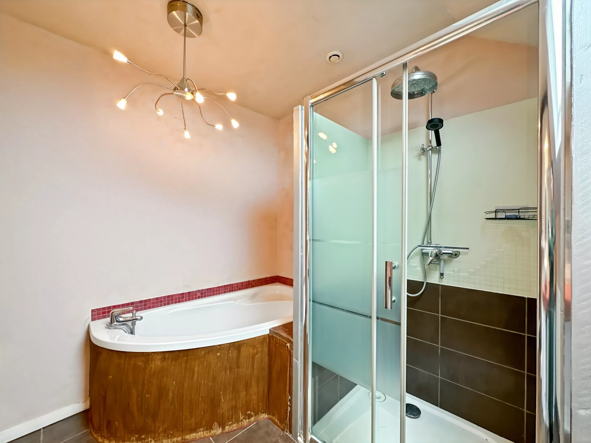 La salle de bain spacieuse dispose d’une baignoire et d’une douche, offrant un confort optimal.