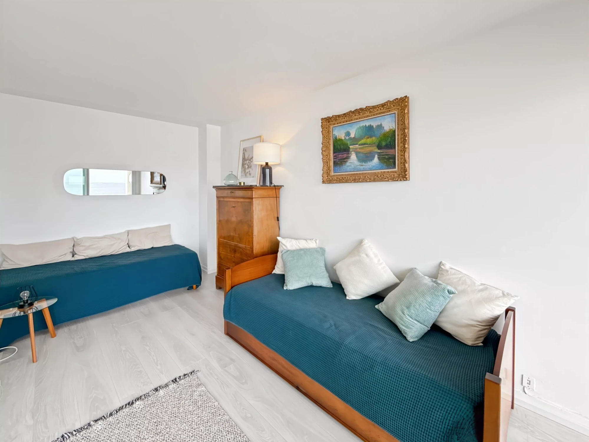 La chambre principale est équipée d’un lit Queen Size et le coin nuit offre deux lits simples, pouvant accueillir jusqu’à quatre personnes.