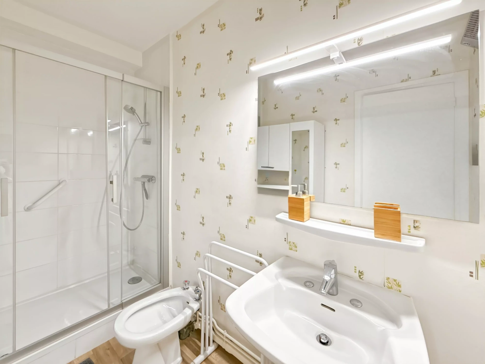 La salle d’eau contemporaine offre une belle douche et un confort optimal pour un moment de détente.