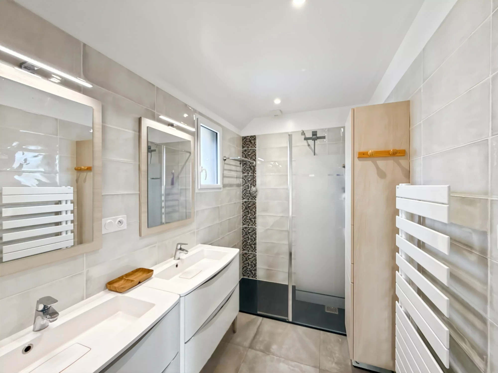 La suite parentale offre un lit king-size, un grand dressing et une salle d’eau avec douche à l’italienne, avec ouverture sur la mer. En rez-de-chaussée, une seconde chambre propose deux lits doubles dans un cadre chaleureux et intime.