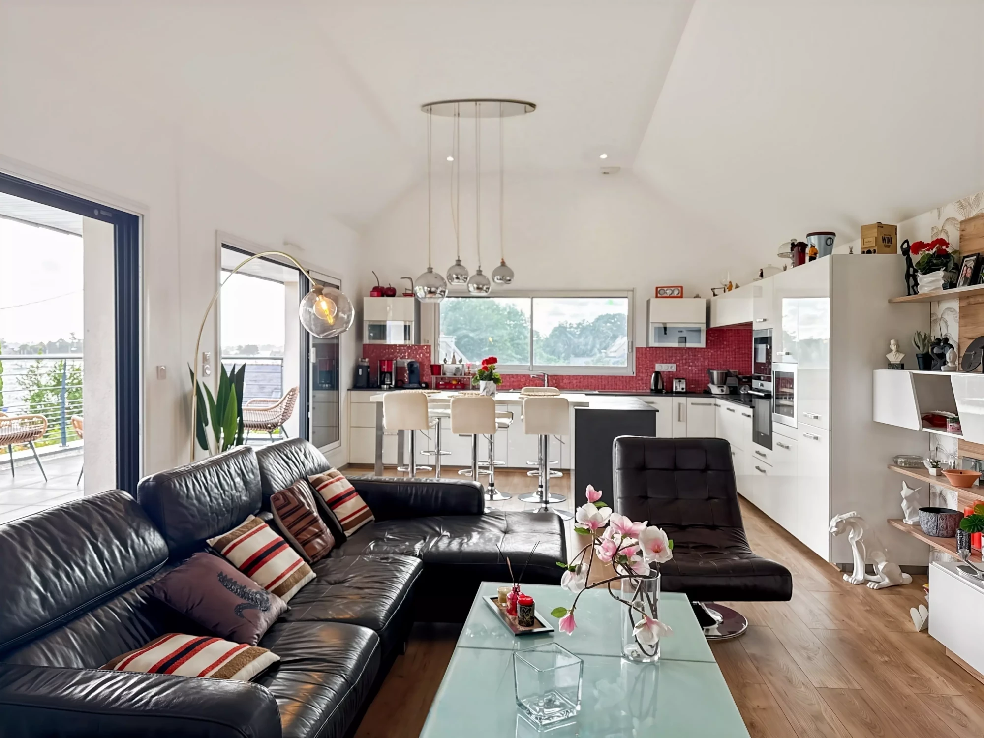 À l’intérieur, un immense salon-séjour s’ouvre sur la mer, complété par une cuisine moderne entièrement équipée.