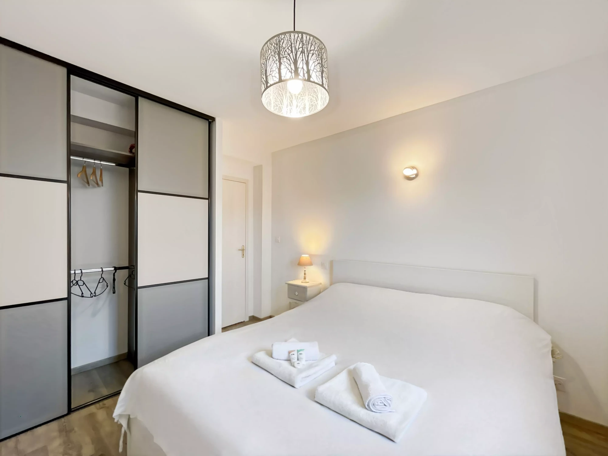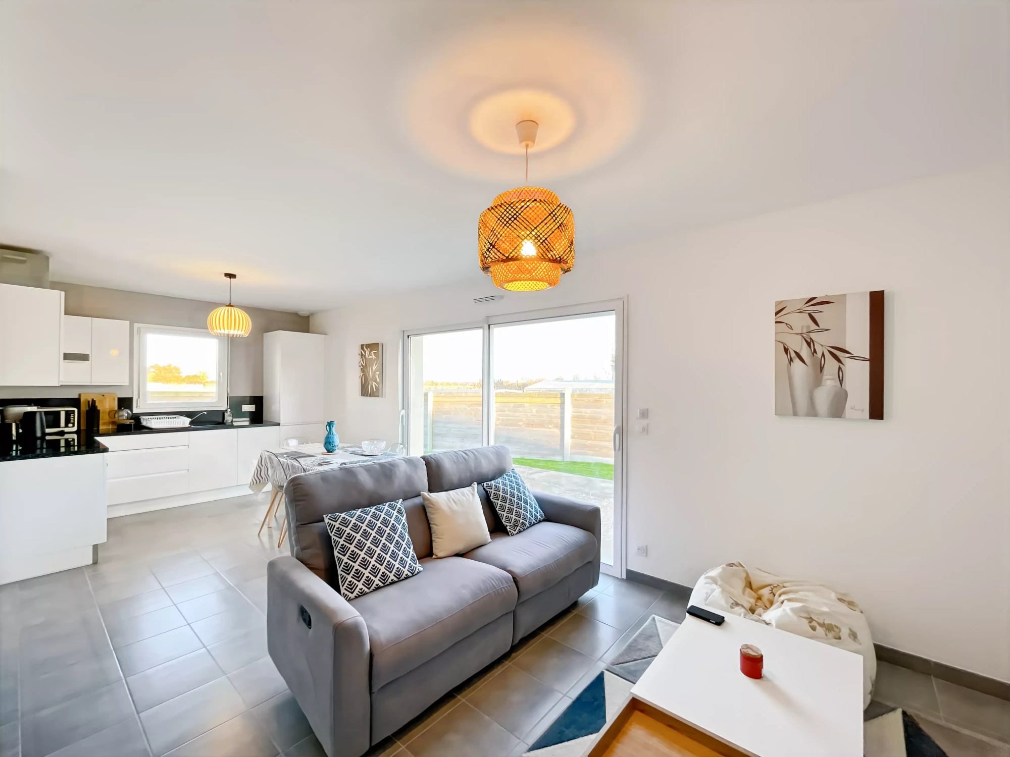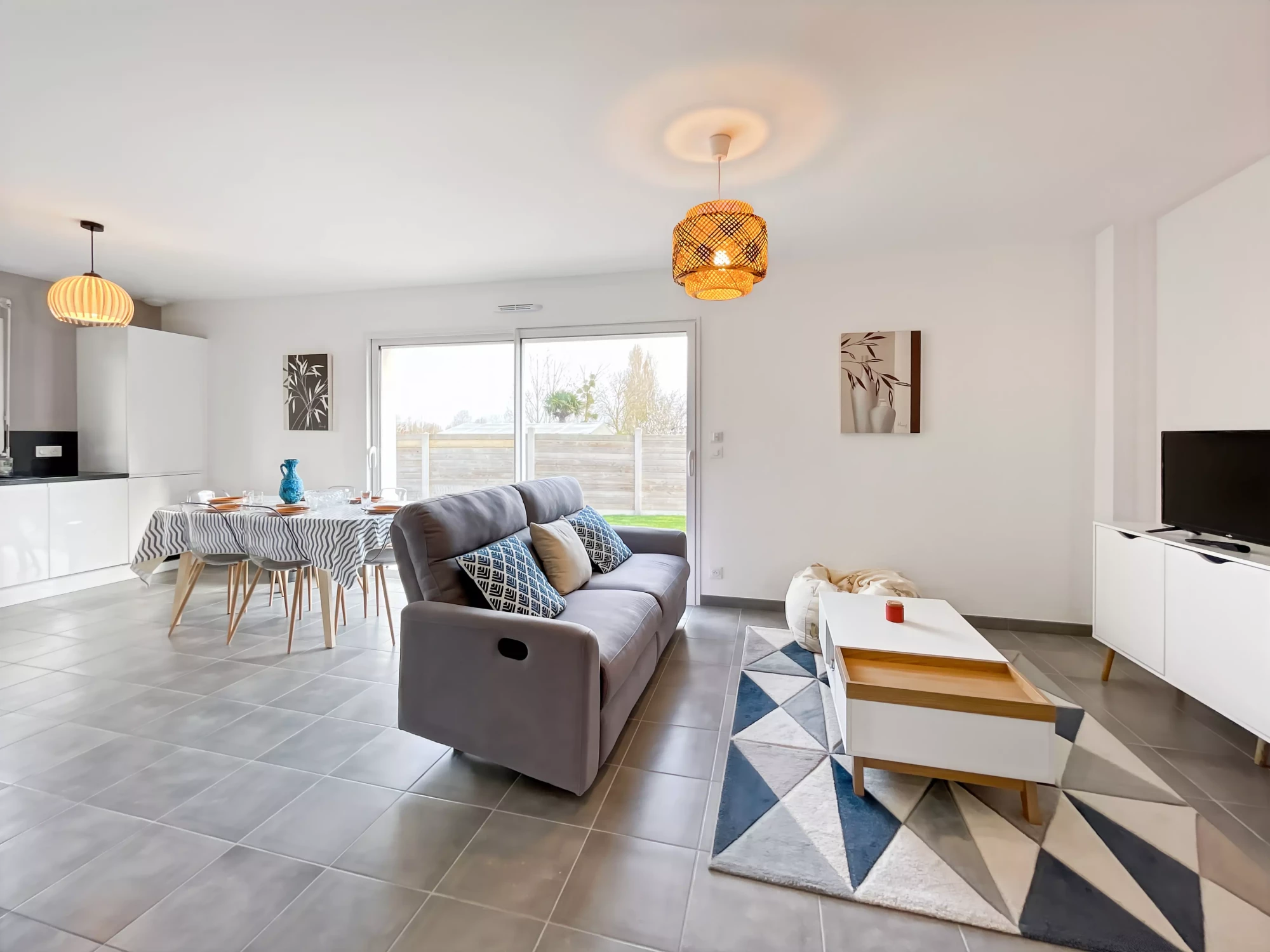 Vous serez séduit par un salon lumineux et spacieux, décoré dans un style moderne et épuré, donnant sur le jardin et ouvert sur une cuisine entièrement équipée avec réfrigérateur, congélateur, four, plaque de cuisson, micro-ondes, cafetière et bouilloire, idéale pour préparer vos repas.