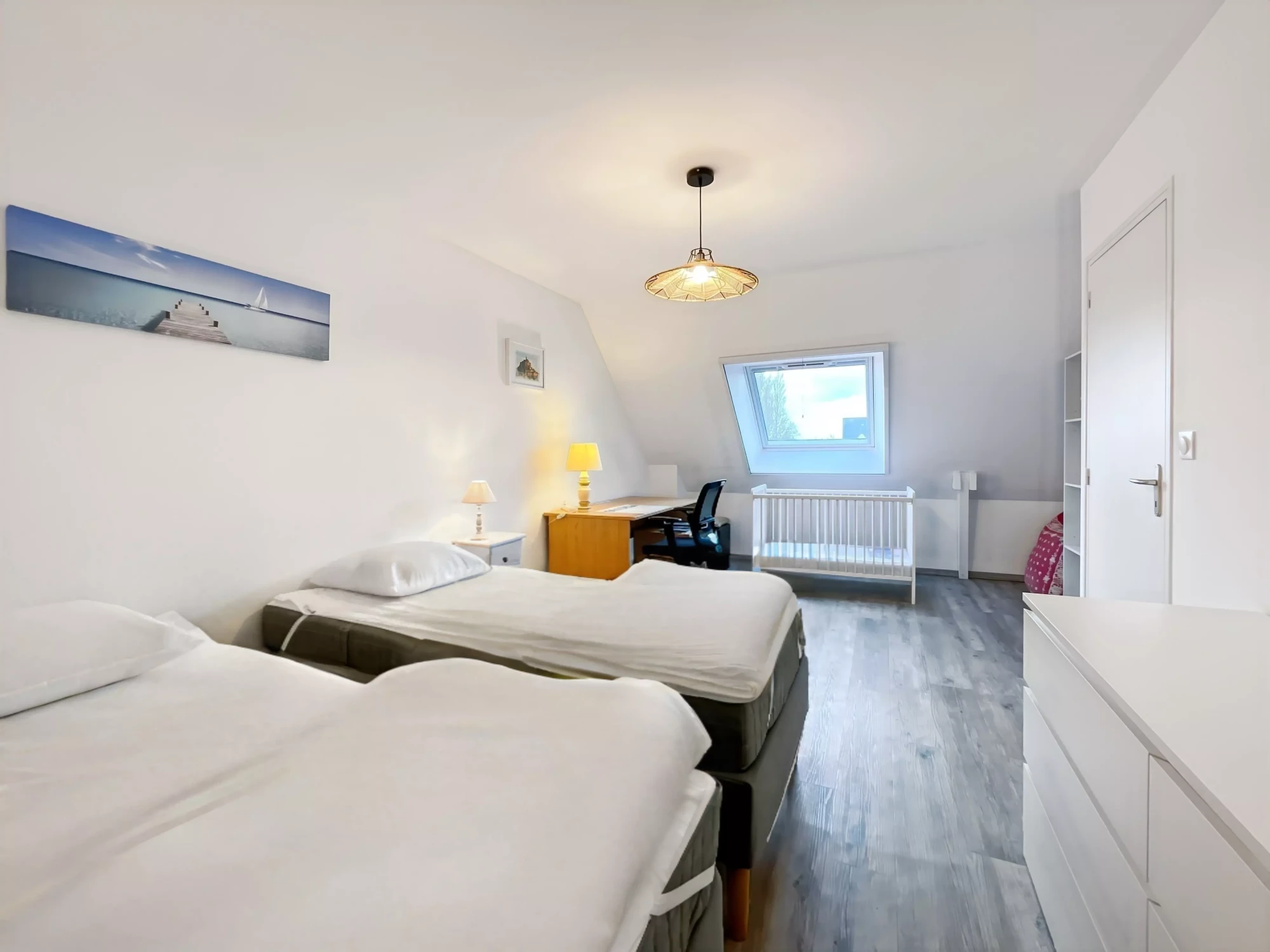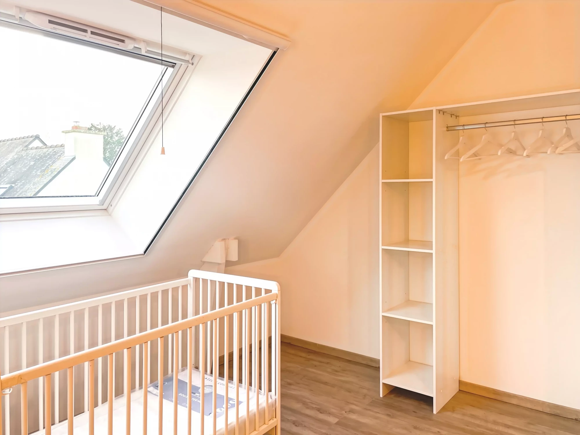 À l’étage, deux chambres supplémentaires vous attendent. La première dispose de deux lits simples, d’un bureau, d’un lit bébé et d’un dressing, parfaite pour les enfants ou comme espace de travail. La seconde comprend un grand lit double et un dressing, offrant calme et confort. Une grande salle de bain avec baignoire, baignoire bébé et table à langer complète l’étage, idéale pour les familles avec de jeunes enfants.