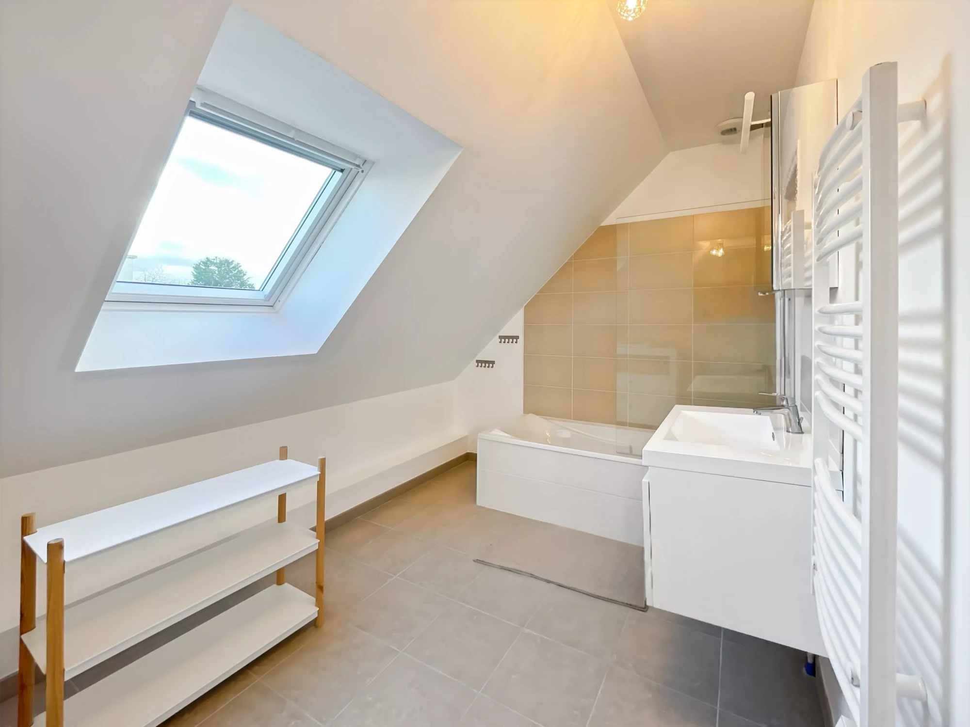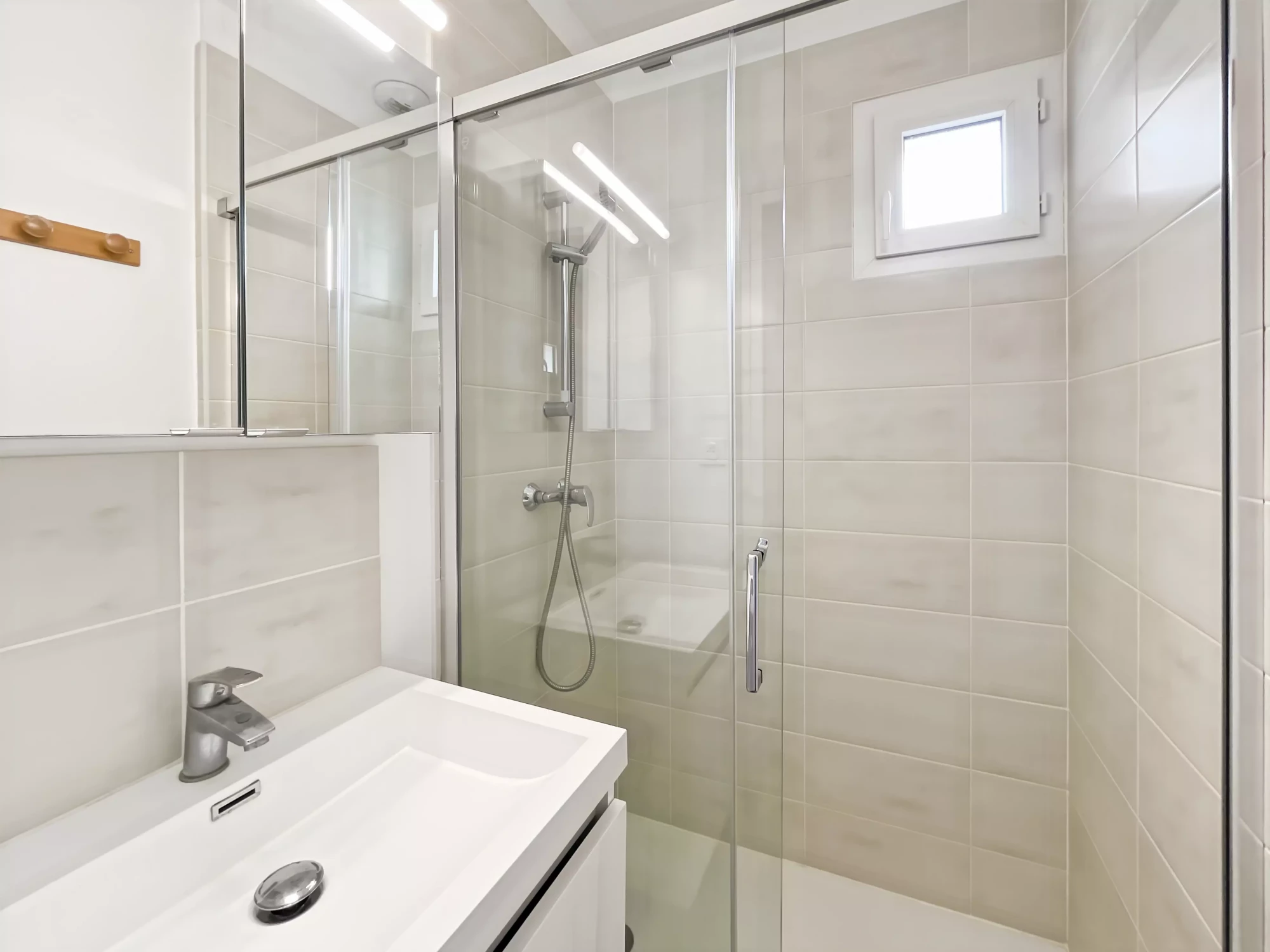 Au rez-de-chaussée, une chambre avec lit double et dressing intégré vous accueille, tandis qu’une salle d’eau indépendante avec douche à l’italienne est à disposition. Une machine à laver séchante complète ce niveau.